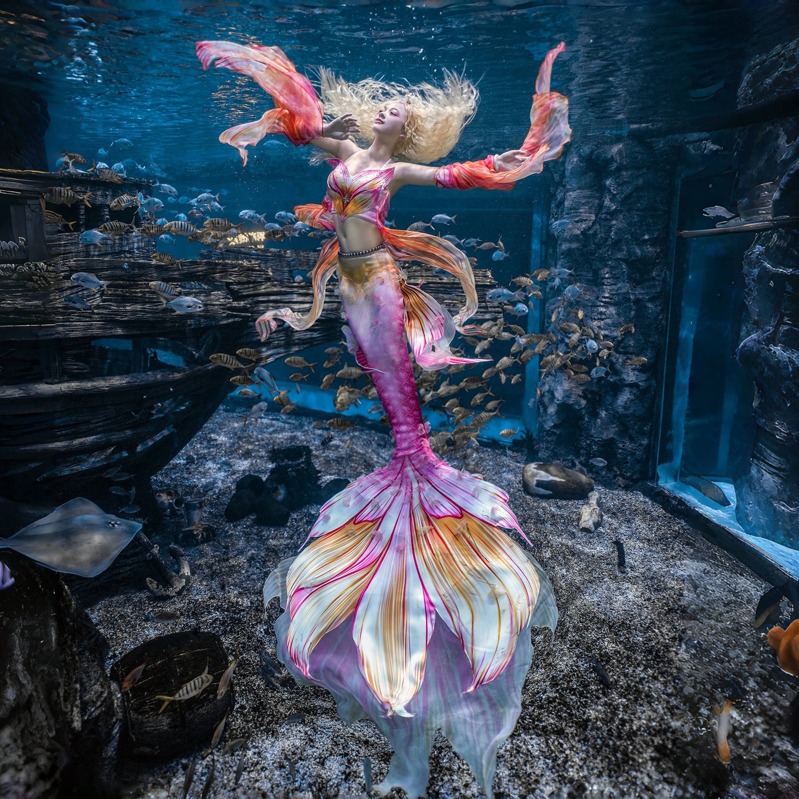 Production time: 7-10 business days (custom sizes available). Perfect for underwater performances, photoshoots, and themed parties.