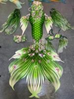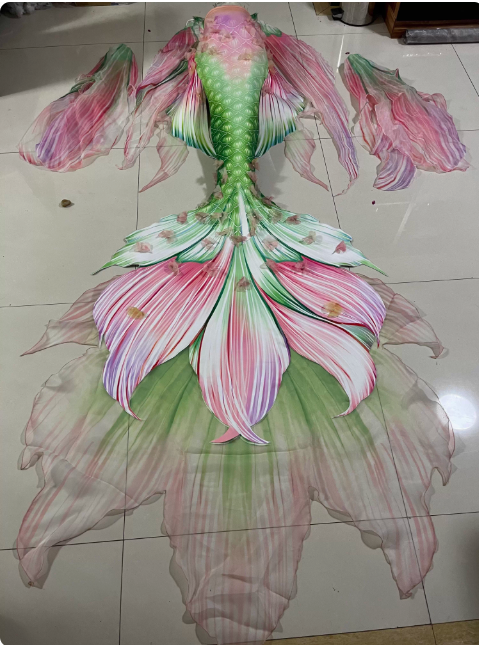 Unleash your inner mermaid with our Original Flower Fairy Mermaid Tail! This exquisite High-End Custom set includes a beautiful tail, beautifully adorned bra top, and flowing sleeve veils – all meticulously crafted. The stunning 3D floral appliqués create a captivating, lifelike underwater fantasy. Perfect for professional performances, photoshoots, or magical events. Handmade to your measurements for a flawless fit. Turnaround time: 7-10 business days. Experience the enchantment of a bespoke mermaid transformation.
