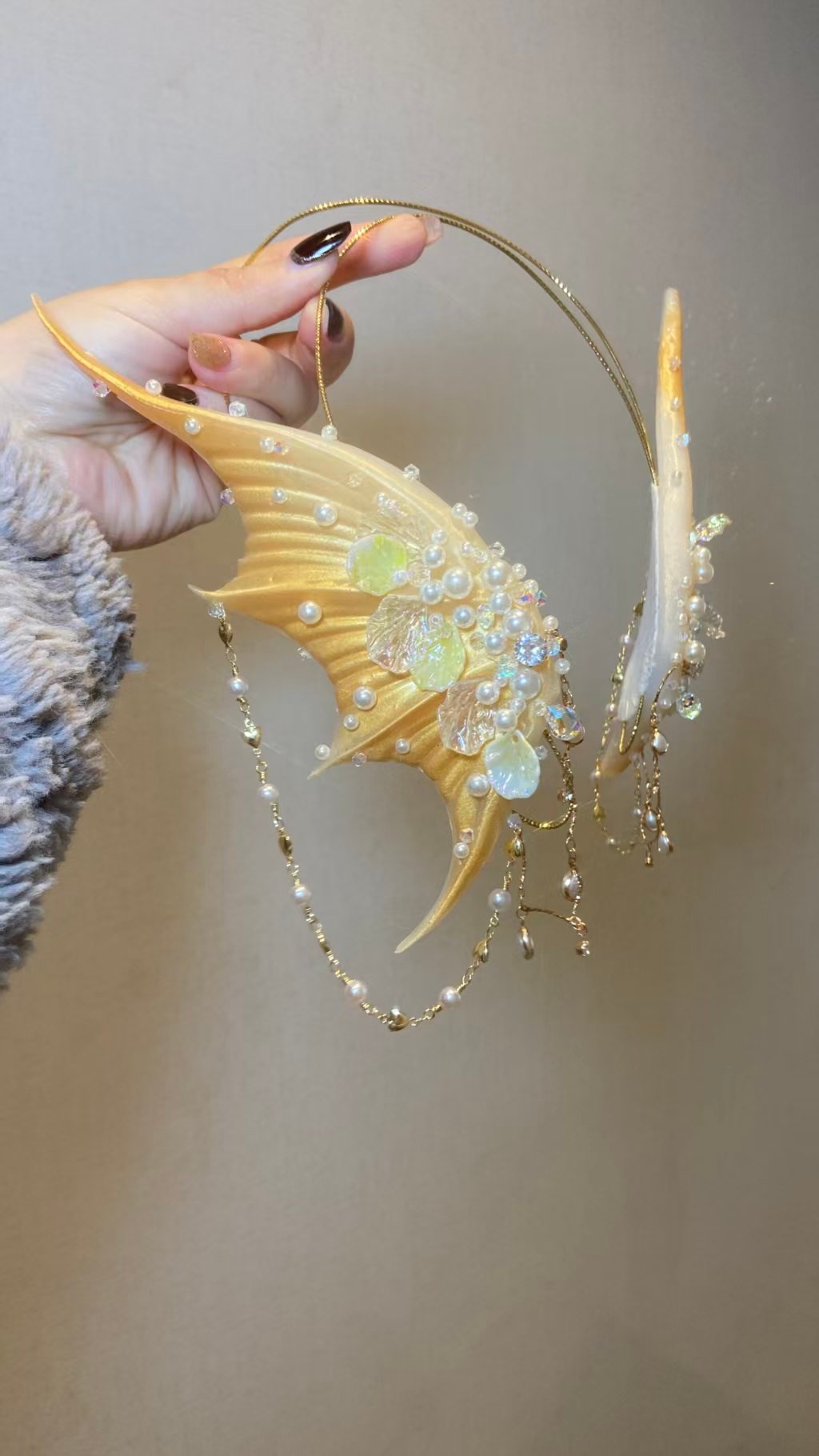 Handcrafted mermaid ear cuffs. The metal parts are copper gold-plated with a delicate texture and fade resistance. Every bead is meticulously hand-sewn with neat stitches and vivid layers. The overall design is ethereal and full of exquisite details. Color can be customized.They stay securely in place when worn underwater, making them perfect for mermaid performances